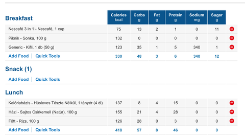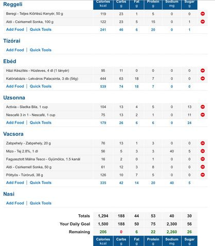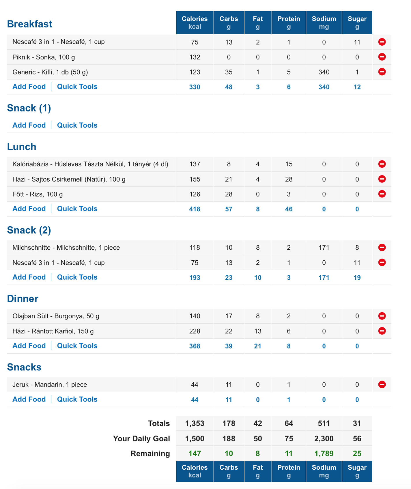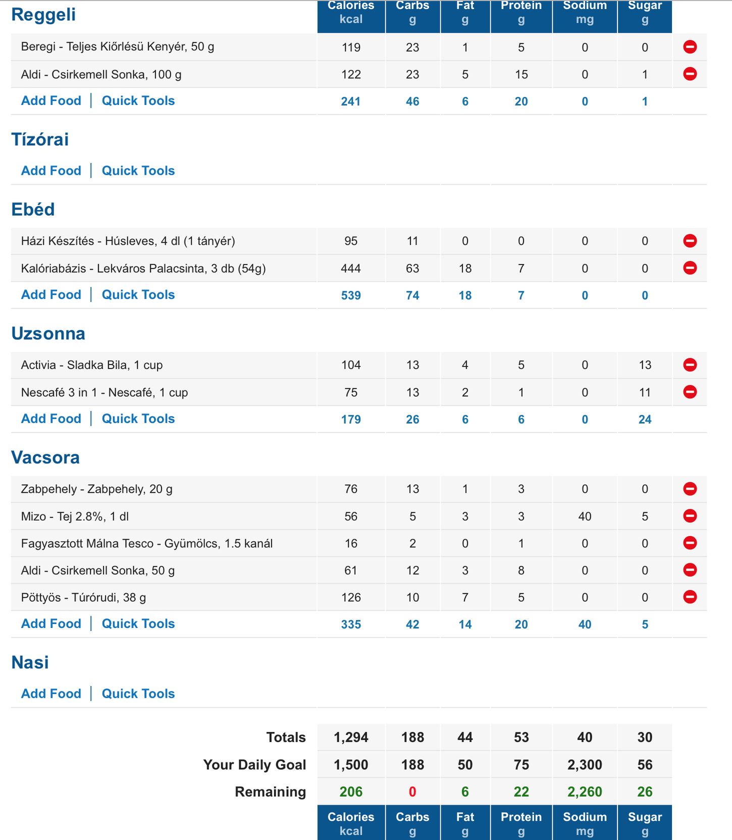Itt van pl a mai bevitelem. Pl a reggelinél nem Aldi csomagolt csirkemell sonkát ettem, hanem boltban kérte 10dekát, de attól az még ugyanúgy csirkemell sonka, és ha itt kicsit több, akkor máskor meg máshol kicsit keveseb lesz kalóriában, tehát egy idő után kiegyenlíti, és pontos lesz. Arra mondjuk törekszem, hogy ha két azonos étel van benne, más néven, akkor általában a nagyobb kalóriásat választom, és a mozgást külön nem viszem fel, mint plusz "ehető" kalória. Tavaly 15kg-t fogytam kb 5 hónap alatt, idén nemrég álltam neki, és még 10et tervezek még év végéig.