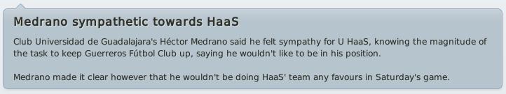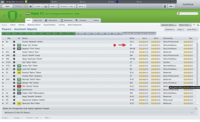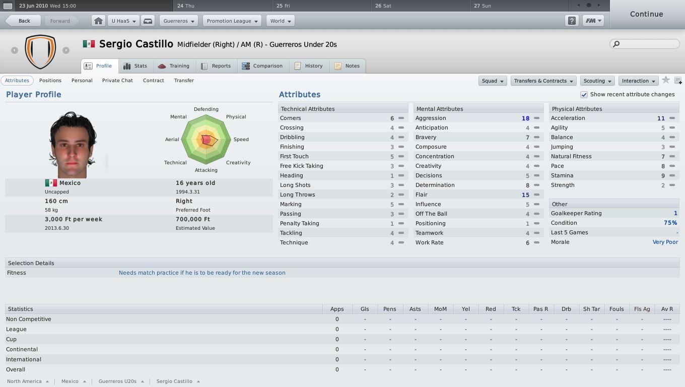 !A csapat nem vészesen rossz (ahhoz képest, hogy az átlagéletkor 15,5 év volt, mikor átvettem), középmezőnyt lehetne belőlük kicsikarni a magyar másodosztályban. Itt viszont nagyon nehéz... nem csak azért, mert sokkal jobb játékosok ellen kell játszani, meg babusgatni a sajátokat, hogy ne legyenek öngyilkosok, hanem mert egyszerűen nem működik a jól bevált 4-4-2 diamond, counterrel. Lehet, hogy csak beképzelem, de valahogy itt Mexikóban nem működik ugyanúgy az, ami itthon a Makóval tökéletes taktikának bizonyult. Érdekes... valahogy nem akarják játszani.