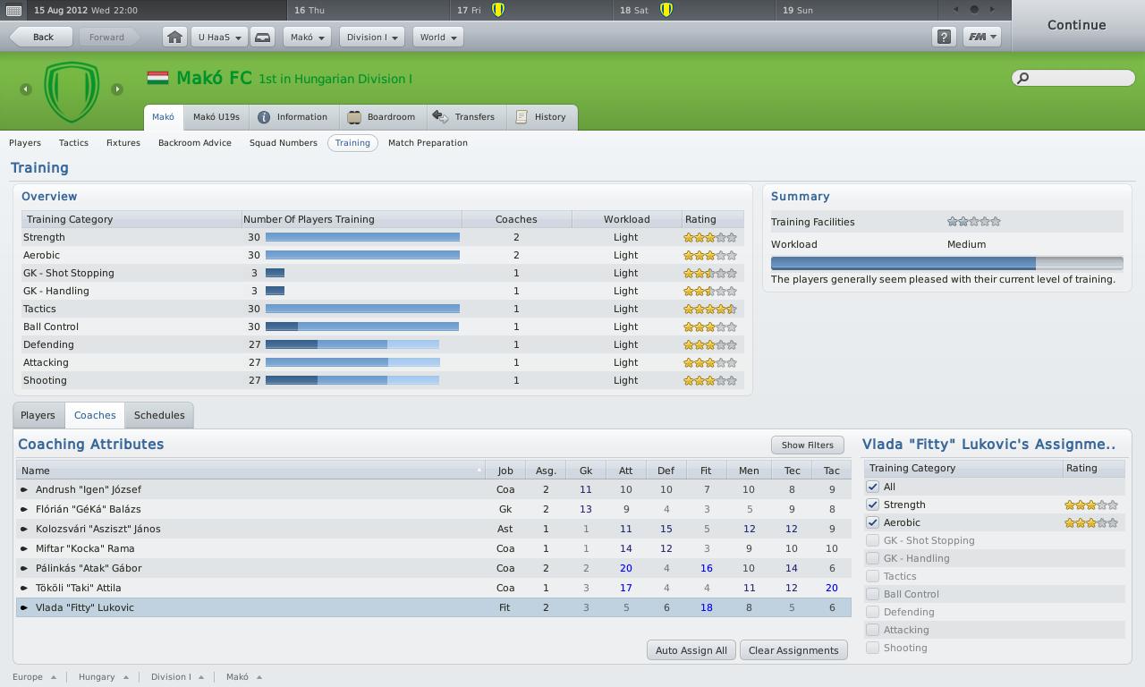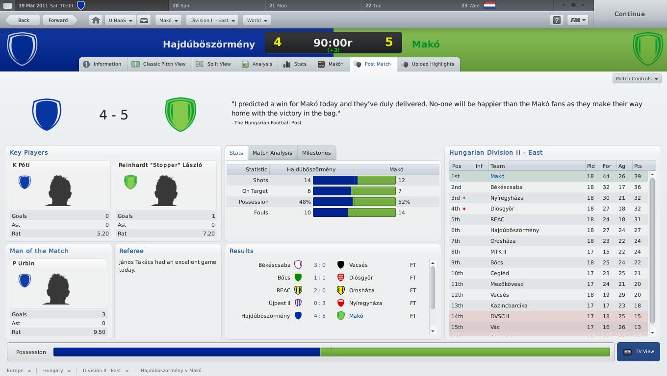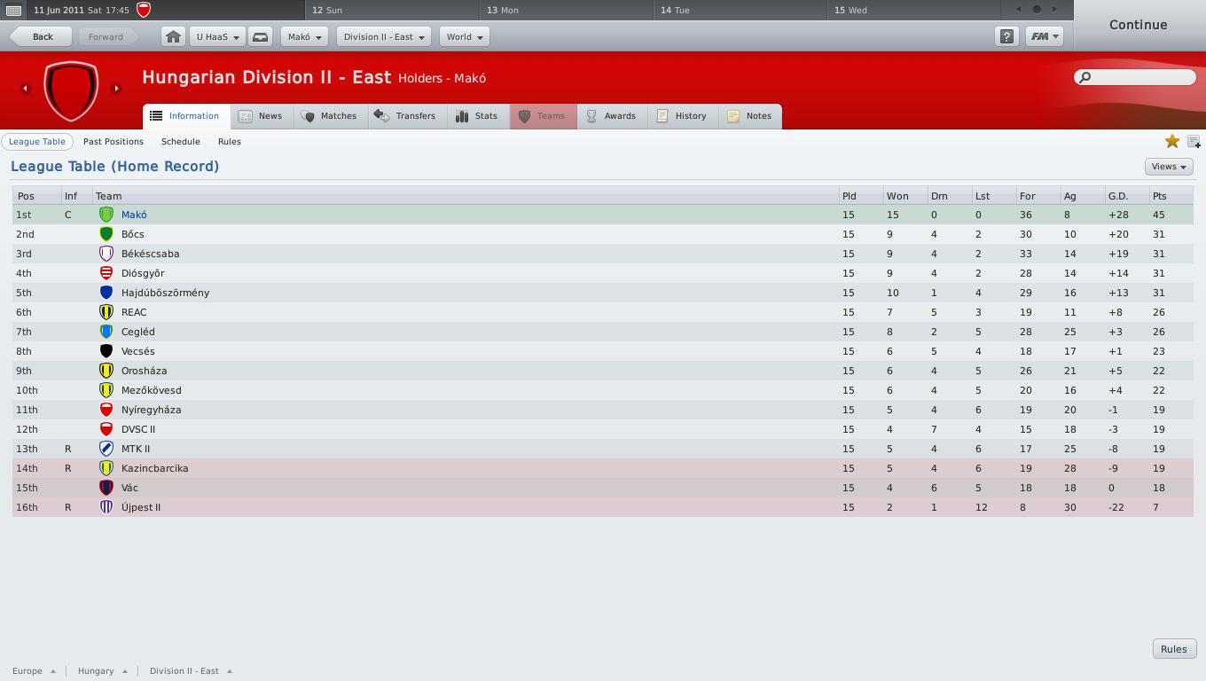 A Haladással játszom, de ritkán van rá időm, így még csak a kezdő szezonban tartok (MK: legjobb 8, a bajnokságban egy utolsó perces 11-sel elszenvedett vereség után 7 meccses veretlenség jött [a bajnokság élén állókat ebben az időszakban alaposan elvertem], aztán meg zsinórban 5 vereség... kissé ingadoznak a fiúk