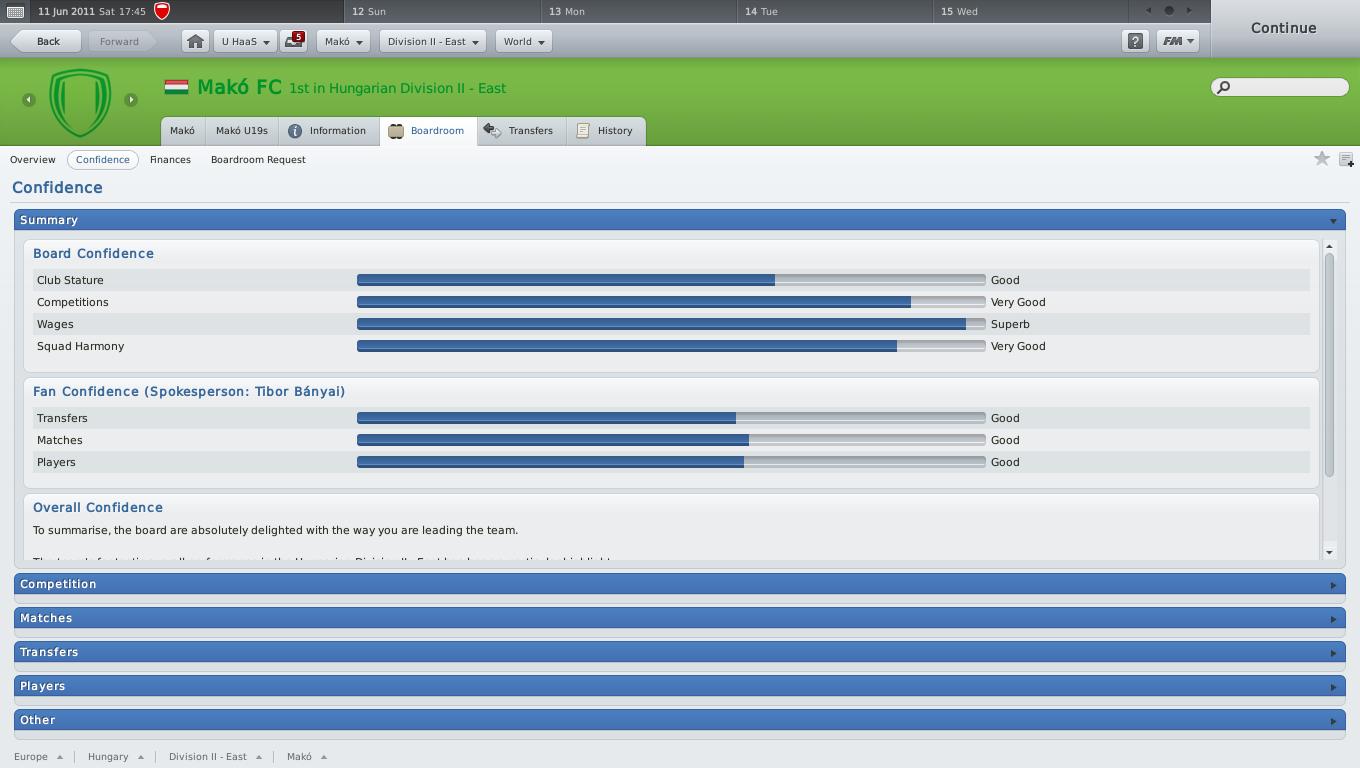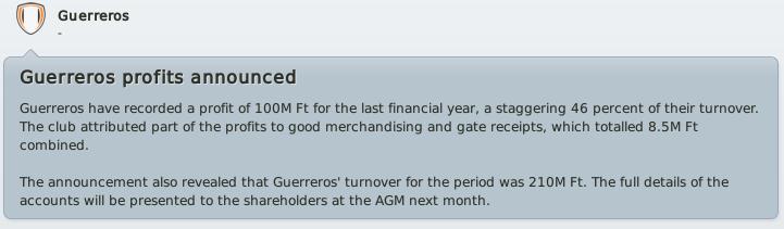 Azért jópár bibi előkerült így. Ott van ugye a 6500 HUF-os limit mindenre, a "nagybevásárlás", mikor rekonstrukció van. (Még a managert is így, 6500/w szerződtetik.) Az is érdekes, hogy hiába hoz a klub többmilliót hetente, ha átléptem a határt, nem hajlandóak emelni a wage és transzfer limiten. Semmiképp.