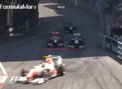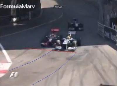 Első kép, féktáv vége. Pirossal megjelöltem ki is van előrébb. Itt még az ideális ív mellékes, de Maldonado a kedvezményezett, mert előrébb van.