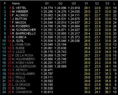 Ebben a cikkben vannak adatok is, a legtöbben 320 felett mentek, míg Button 316 km/h, Hamilton 314-et. Whitmarsh nyilatkozta, hogy sokat veszítettek az egyenesben a qualon, többet, mint amit behoztak a lassú részeken. Azért erre az edzéseken rájöttek volna, és cserélték volna a szárnyat, ha tudták volna. -