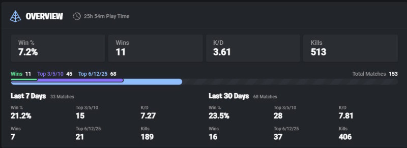 Én nem szoktam számolni, de ha lehet hinni a Fortnite trackernek akkor 153. Szóval fele annyi sincs mint a tied. Játékidőben is kevesebb mint a fele a tiednek, ami a BR-ra esik