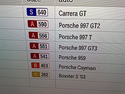 Na itt is van egy "jó" példa. Itt ha olyan autóval indulok, amivel jó versenyt tudok összehozni az A-s autókkal, akkor a Carrera GT ellen esélyem nincs. Ha a Carrera GT ellen esélyes autóval indulok, akkor pedig máris csak két személyes a verseny, abba már egy A-s autó sem szólhat bele. A Boxster meg egy vicc mit keres ebben a mezőnyben, de a Cayman sem lehet senkinek ellenfele.