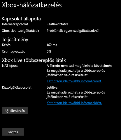 Baszkuráltam az Xbox Live kapcsolatot a Gépházban, újraindítottam és úgy néz ki az volt a gond. Valami Teredo miatt sírt. Most mérsékelt kapcsolatot ír és azt hogy csatlakoztatva. 162ms és 1% csomagvesztés. Ami érdekes, mert beton stabil diginetem van, és sosincs packet lossom.