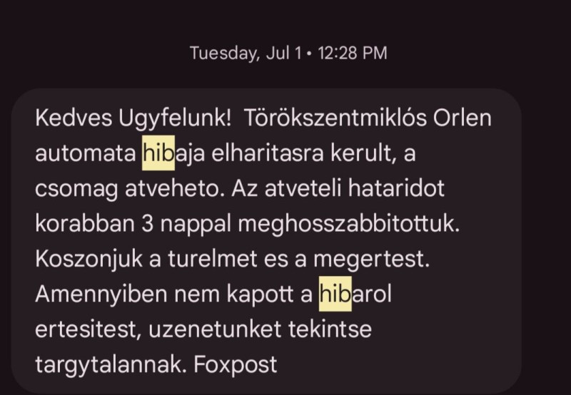 Megjött az üzenet, hogy ott van az automatában (majdnem 2 hétig tartott, ez már fel sem tűnik), erre rá pár órára jön egy ilyen sms a 70/7009878 számról:"Kedves Ugyfelunk! Mòr ALDI automata hibaja miatt csomagjat nem tudja atvenni. Amint a hiba elharul ertesitjuk. Kerjuk a javitasrol szolo ertesitesig ne menjen a csomagert (a "csomagod mar nagyon var" ertesites nem a javitasrol szol). Az atveteli hataridot 3 nappal hosszabbitjuk. Foxpost"