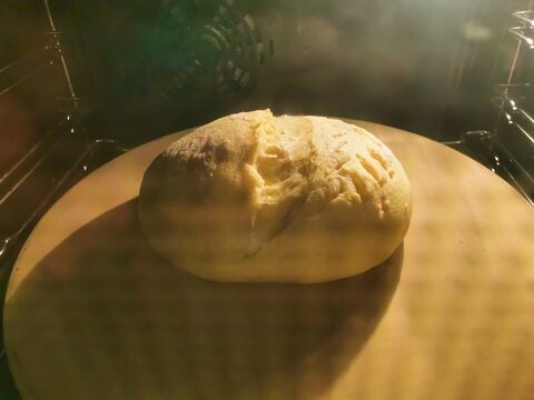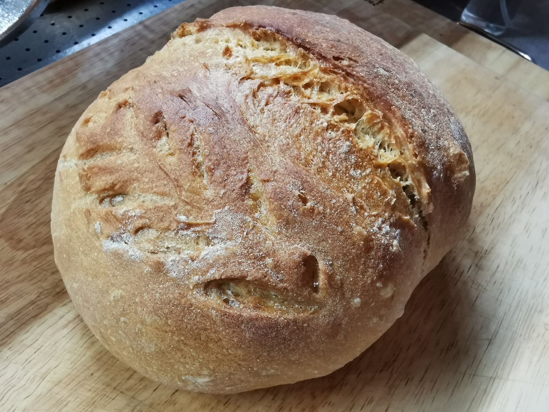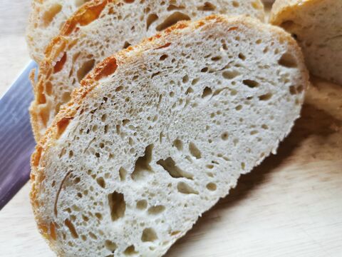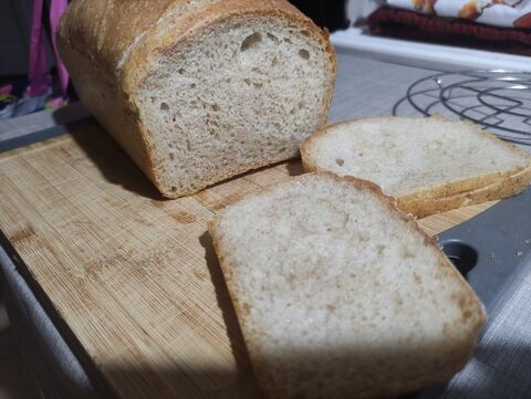 Reggel gyártottam egy poolisht, ami szobahőn volt du-ig, aztán dagasztás, 3x laminálás, majd egy óra kelesztés után sütés kövön gőzzel 25p-ig 240 fokon majd kb ugyaneddig 200 fokon. Bl 80 gyermelyi, 65 hidro, fél tasak instant élesztő, mokkáskanálnyi oliva, kb 60 dkg lett.
