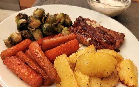 Ma reggel 7 előtt támadtam a Coop-ot, vettem megint (1.4kg+) sertéscombot. Nem tököltem vele, egészben tettem fel, mustár-olaj kombóval kentem csak. A nagy jénaimba épp belefért.