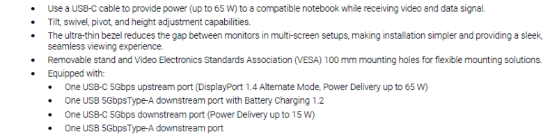 "1 USB-C 5Gbps upstream port (DisplayPort 1.4 Alt Mode, Power Delivery up to 65 W)