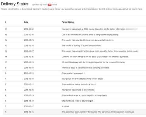 Az eglobal oldalon van valami contact support opció (talán jobb alsó sarokban?), ott rájuk írtál már? Én egyszer két hét várakozás után írtam rájuk, vissza nem írtak, de talán másnap vagy harmadnap lett DPD tracking és át is lett adva.