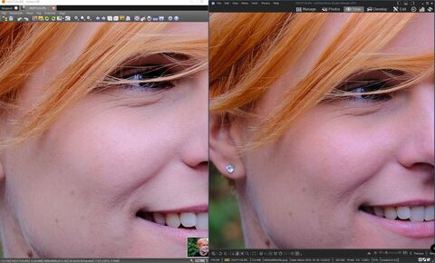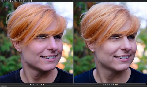 A vázban lőtt Astia filmszimuláció és a CR-ben (LR-ban) ugyancsak Astia filmszimuláció van beállítva a két képen. Ami zavar, hogy a vázban (az én ízlésem szerint) nagyon vöröses lett az arc a -1 color ellenére, míg a CR-ben a +40 vibrance ellenére is még messze van a két kép színvilága egymástól, vagyis a vázban nagyon máshogy működik a filmszimuláció, mint az Adobe cuccban.