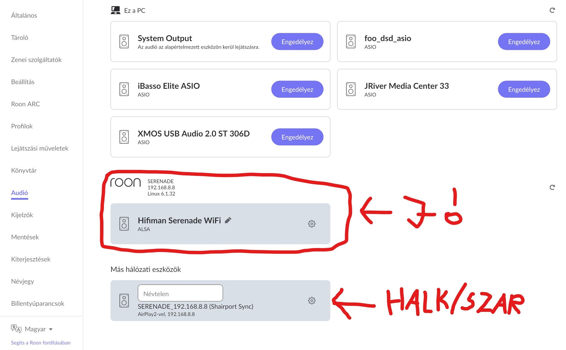 Nálam a PC a Roon szerver és a streamer a streamer, tehát nem USB-n megy a zene és rohadjon meg jól szól, a Tidal is. Viszont két eszközt talált ugyanazon az IP címen, az egyikkel hangos (ugyanannyira mintha USB-n hallgatnám) és szépen szól, a másikkal halk és szar a hang, ez itt van a beállításokban: [kép] (nyilván Nálad nem tudom hogy néz ki, de lehet van több választásod), azt kell választani ami jobban szól.