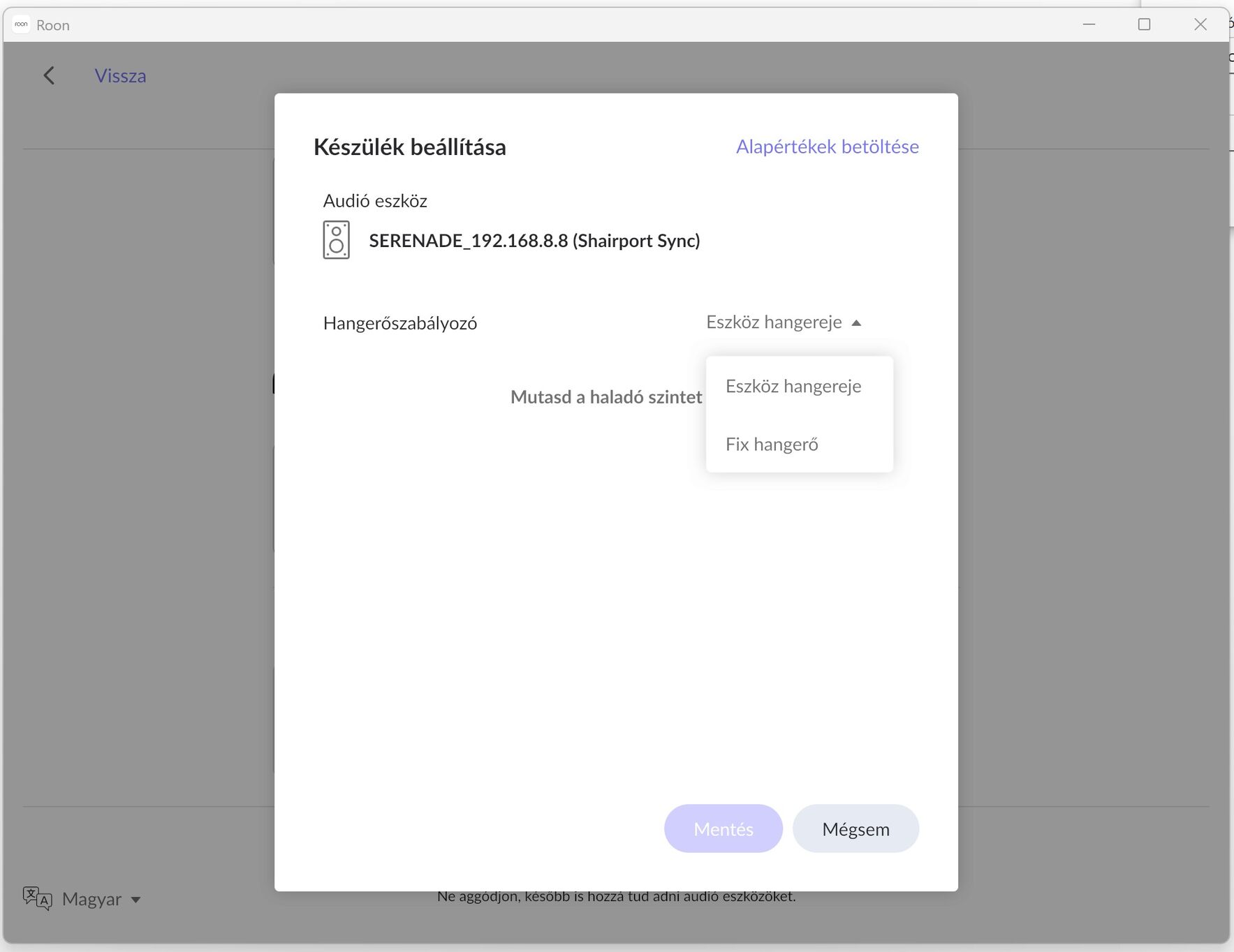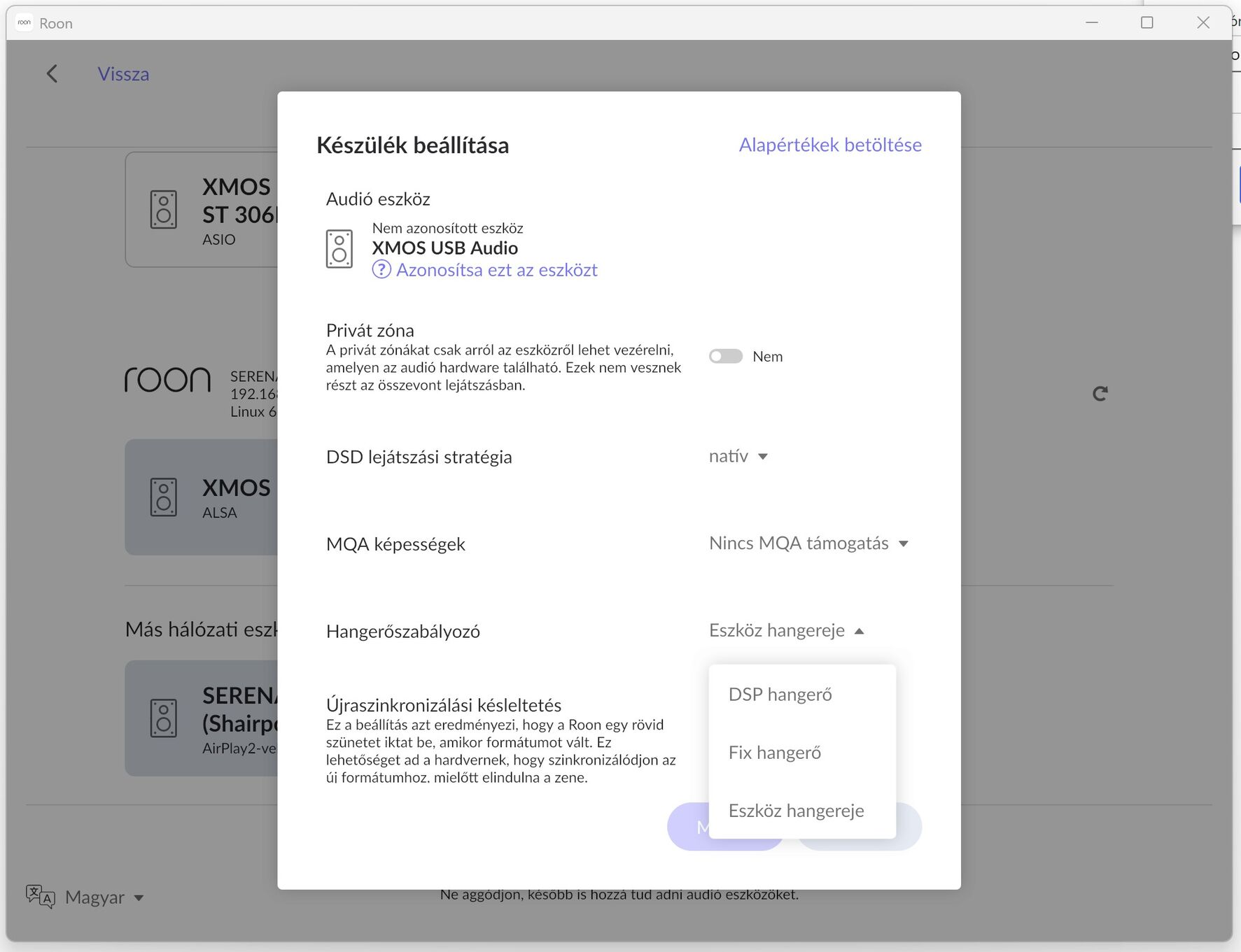 Hangerő. Ez fura. A készülék beállításoknál neked mi van beállítva, az az eszköz hangereje, vagy fix hangerő? Milyen mintavételi frekit, bitrátát enged továbbítani a Roon?