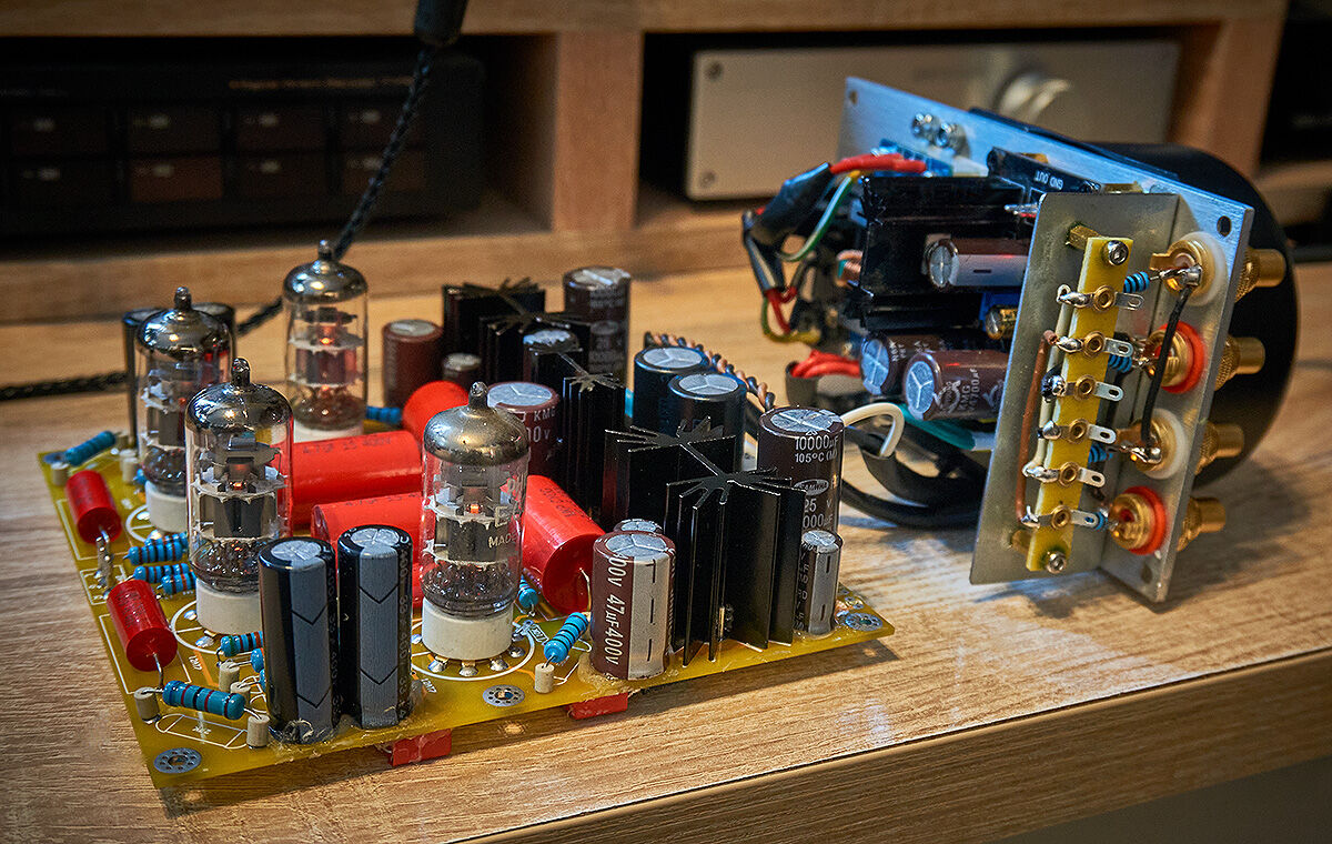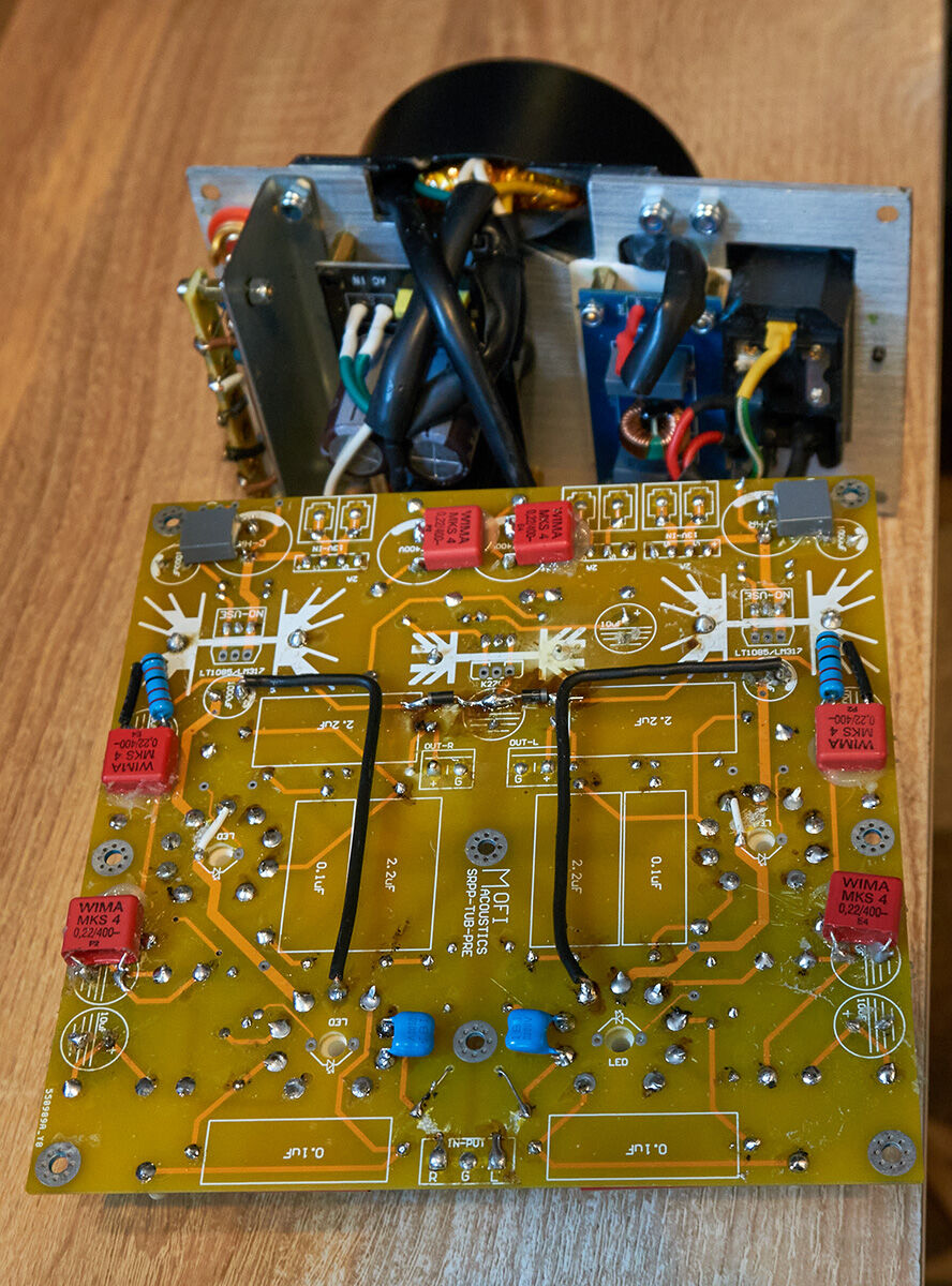 A modulon gyárilag található 2 db WIMA MKS kondit kikerültem, és külső, MKP10-ekkel "helyettesítettem". (A két piros téglatest a forrlécen).