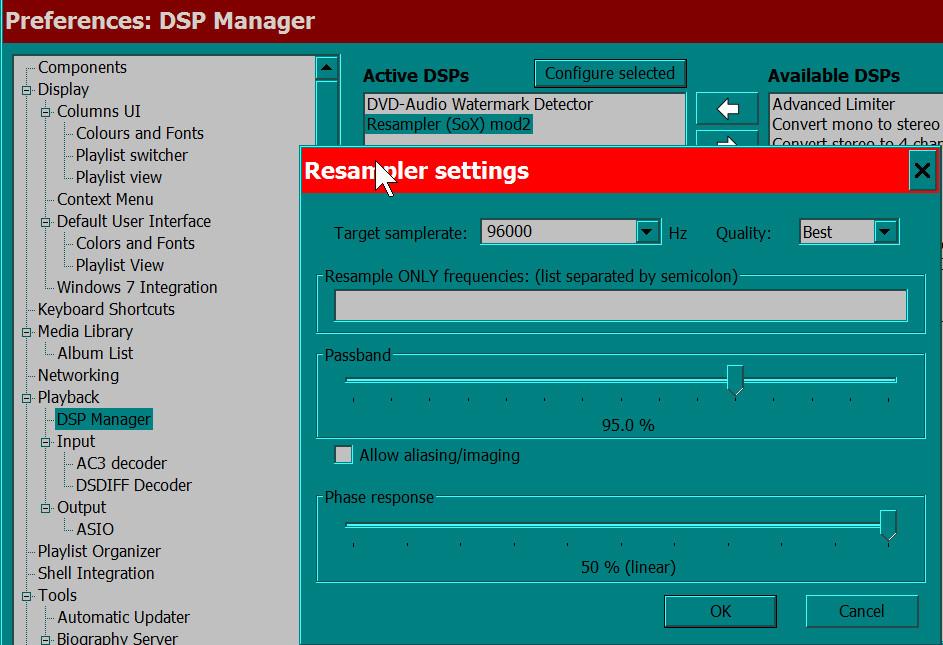 Tehát tegyük fel van egy olyan eszközöd, ami csak 96kHz-et kezel a 44,1 és a 48 mellett. Ilyen esetben két példányban kell betenni az aktív dsp listába. Az egyiket beállítod 44,1kHz-es targetre, és a forrásfrekvenciához beírod: 88200;176400 A másikat 96kHz targetre állítod, és a forrásfrekvenciához 192000 kerüljön. Ez csak egy példa, hasonlóan kell beállítani a saját eszköz képességeinek megfelelően.