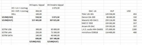Nos, készítettem egy excelt, valahogy így kalkuláltam a "milyen táp, milyen zajszűrők (SOtM rész) és milyen DAC -ok mennyibe kerülnek" témában. Az árakat a német-angol amazonról vettem és konvertáltam dollárba, hogy ne legyen annyiféle deviza. Szerencsére folyamatosan viszik az asztali gépem cuccait, így, plusz egy novemberi fizuval a tétet is tudom emelni. Ezekből kell valami jót bevásárolni