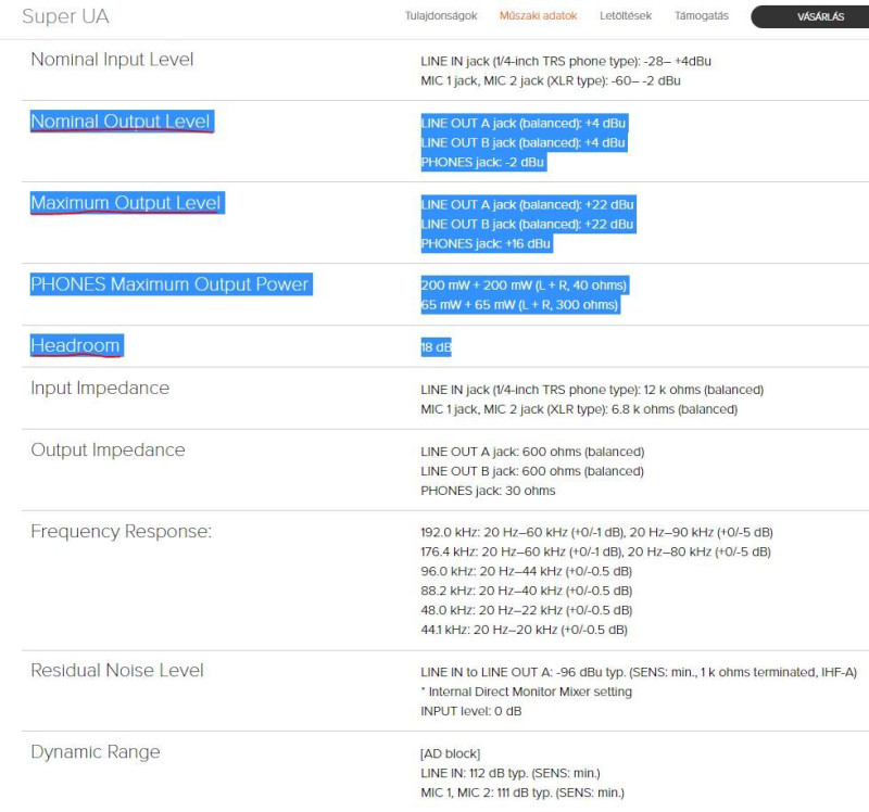Látható a képen, hogy megadja a nominális szintet, ami +4dBu. A +4dBu 1,228Vrms-t jelent most (professzionális audio eszközök line level wikipédia) illetve a képen látható még hogy rendelkezik 18dBu headroom-mal is, tehát a max level összesen 22dBu (kb 10Vrms) a 0dBu-hoz (0,775Vrms) képest .