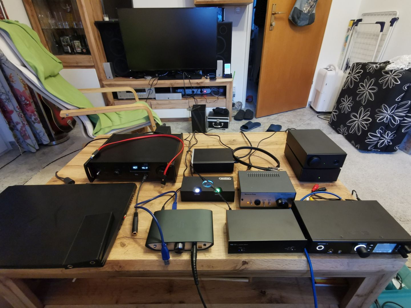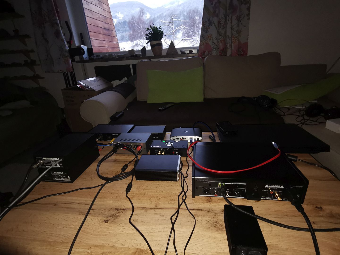 Aztán szépen megjött a többi cucc is. Hétfőn pocsék idő volt - szakadó hó, szél, hideg - szerencsére csak délelőttre volt munkám. Délután "átrendeztem" a szobát és jöhetett a "nagy összeeresztés"...TEAC NT-505X: elég jelentőségteljes megjelenése van, komoly cucc benyomását kelti. A playstore-ból letőlthető alkalmazása, na az borzalmas. A tervezőjét arra ítélném, hogy csak azzal hallgathasson, menedzselhessen zenét. Szerencsére a BubbleUPNP is simán kezeli a cuccot. Sajnos csak egy 3,5 jack bemenet van a fejesnek, de sebaj, van adapter.