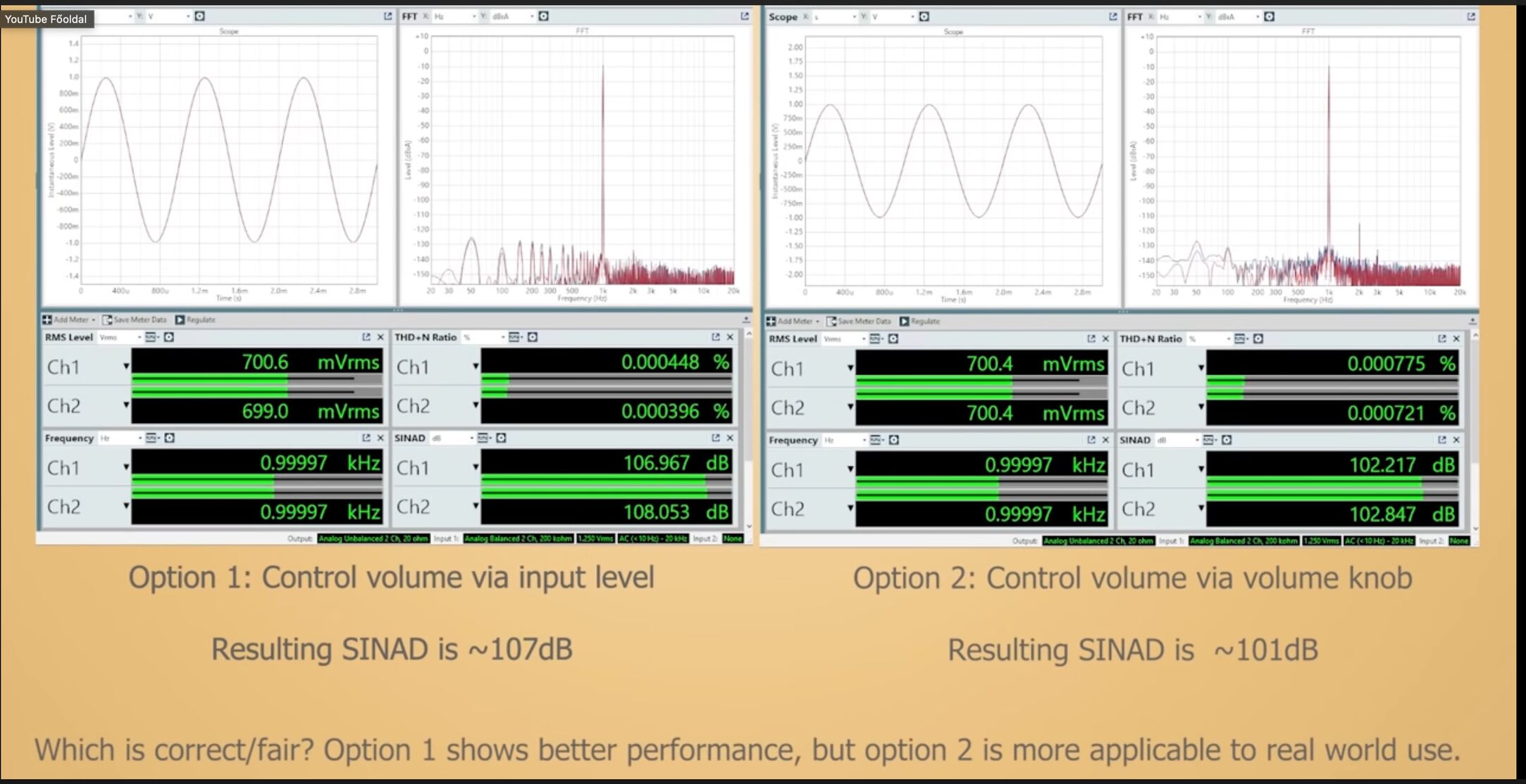 Nem értem miért szeretnél vitázni olyanról, ami szóba sem került. Ha mást mérek, persze, hogy más lesz az eredmény, de a kiemlet oldalaknál készülékeknél feltüntetett Sinad érték nem egy tól-ig szám hanem egyetlen érték, ami alapján sorrend van megállapítva, ami használhatatlan. Erről szól a videó. Vagy te mit láttál?