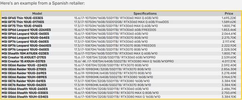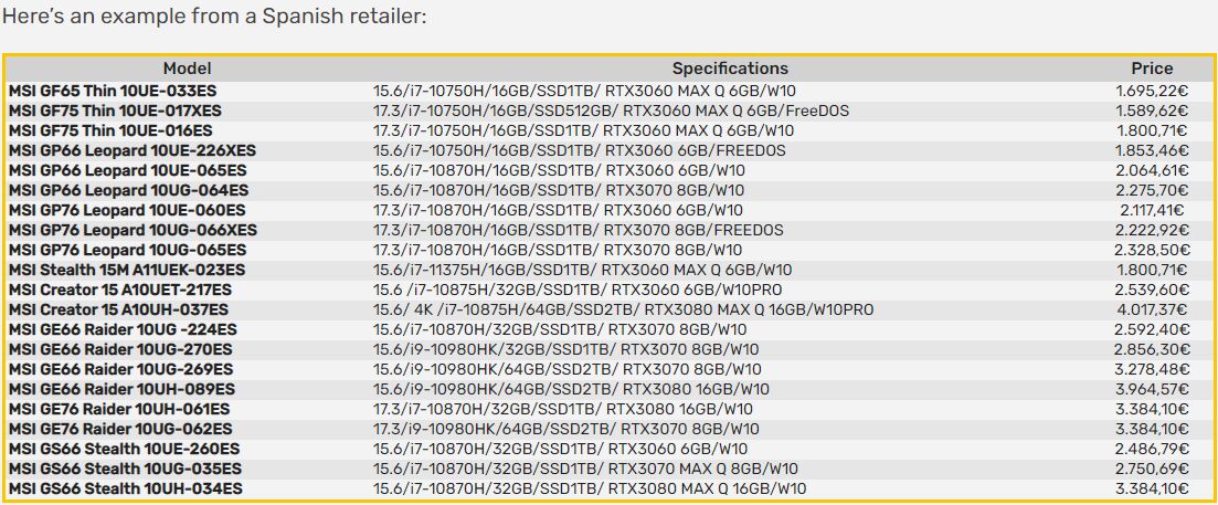 Eszerint az árlista szerint, csak a GF, Creator és a Stealth szériába lesz max-q. A GP/GE teljesértékű RTX3060/3070/3080-as lesz.