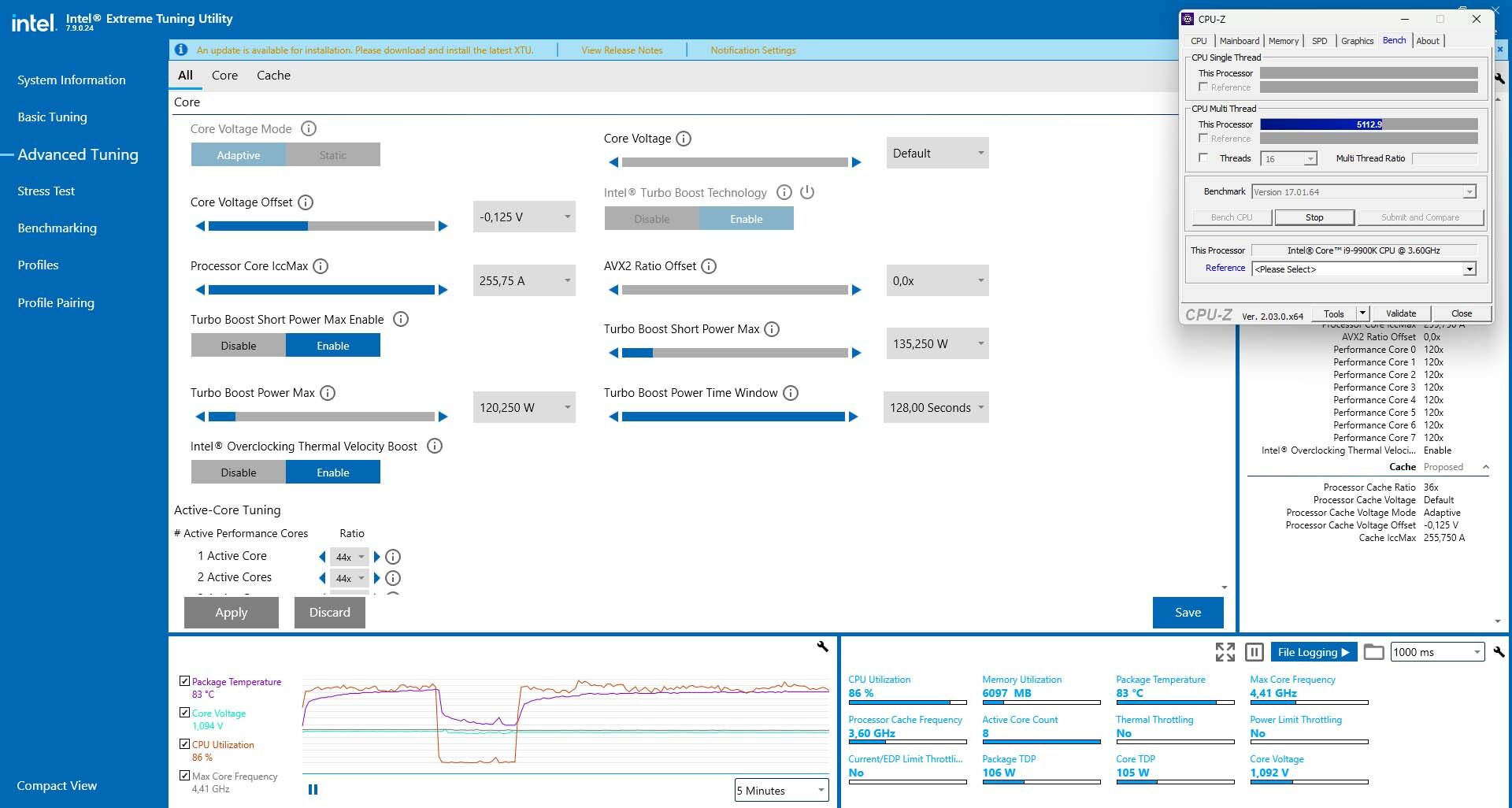 A CPU ezzel a hozzáállással 95W felett bírja a végtelenségig ami érdekes. Nincs 100% az Utilization viszont a 100+Watt benyelődik és a cpu-z pontszám is marad fix.