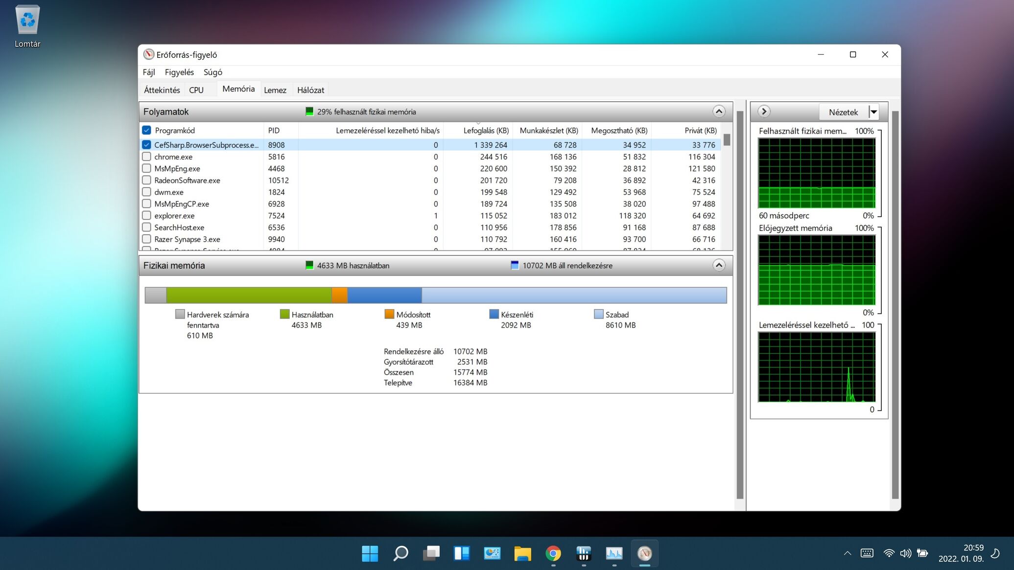 Vettem egy razer 14 gépet,AMD Ryzen 9 5900HX -GeForce RTX3070 (100w),2x8gb rammal,ami fix forrasztott, és az egyedüli gondom, hogy ha hosszabb ideje böngészek, megnyitva 8-10 lap pl, akkor elkezd fogyni a memória,és el is fogy (Chrome). virtuális memó auton van, semmi különöset nem állítottam el. elfogy minden memória, elkezd a kép villogni, kiírja hogy nincs elég memória a lap megnyitásához. A felbontást is elállítja, vagy csak a nagyítást, nem néztem. Ja qhd,165hz. Optimus megy, nem tudom mi nem jó. Turbó boost kikapcsolva,annyit állítottam winbe, mert 3.3ghz 16 szálon bőven elég netezni,filmezni. Egyébként nagyon brutál kis gép.
