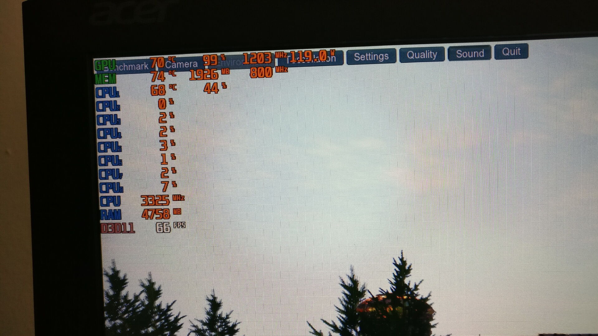 A benchmark programok pontosan egy óra hosszáig futottak, extreme/ultra beállításokkal, kivétel a superposition, mert ott nincs végtelenített lejátszás, ezért a 17. scene-nél készítettem a képet.