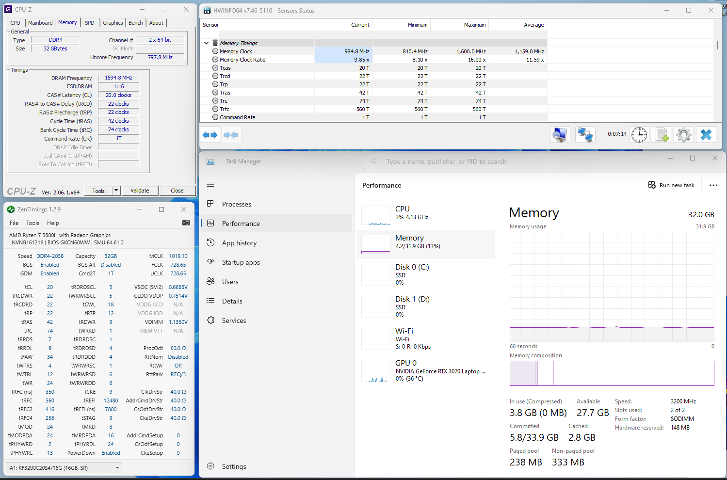 Főleg a HWinfo-s képen látható, hogy mekkora skálán mozog. Amikor terhelés van, egyébként végig 1600 Mhz-t mutat ahogy a 3200as ramnál kell. De ugyanígy folyamatosan változik a freq a Zentimingsban is a speed-nél, ha épp nincs max terhelés. Gép mindeközben performance módban van. KF432S20IBK2/32 ramok kerültek a gépbe.Teljesítményben egyébként a következő eredményeket kaptam, ramcsere előtt, után: