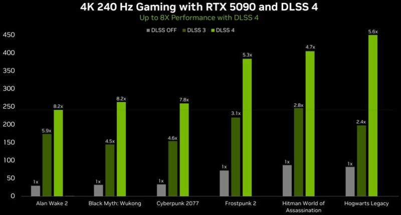 "DLSS 4 alatt a Performance Mode és a Multi-Frame Generation használata mellett a natívhoz képest jókora gyorsulást láthatunk, és a tesztelők szerint a képminőséggel sincs különösebb baj, ami mindenképpen jó hír lehet. Alan Wake 2 alatt például 42 FPS-ről 305 FPS-re nőtt a teljesítmény 4K/UHD felbontás és maximális részletesség alkalmazása mellett, míg Hogwarts Legacy alatt 68 FPS-ről egészen 324 FPS-re katapultált a teljesítmény, méghozzá Ray-Tracing mellett. Star Wars Outlaws alatt 59 FPS-ről 346 FPS-re nőtt a teljesítmény, míg Dragon Age: Veilguard alatt 61 FPS-ről 260 FPS-re nőtt a sebesség. Utóbbi két játék alatt is aktív volt a Ray-Tracing támogatás..."