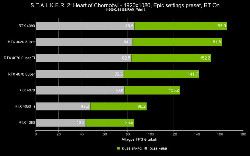 "....A Super Resolution felskálázást és Frame Generation képkocka-generálást is használó S.T.A.L.K.E.R. 2: Heart of Chornobyl játékban még impozánsabb a sebesség növekedése: a DLSS bekapcsolásával a GeForce RTX 4060 által elért átlagos sebesség megegyezik azzal, amit a GeForce RTX 4090 adna DLSS 3 nélkül..."