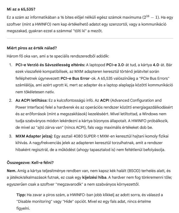 Meg is állt a szívem egy pillanatra. Látszólag amúgy minden rendben, van teljesítményem is....néha 24 órát hagyva futni a laptopom jön egy fekete hátterű hibaüzi újraindulás mellett, érdekes. Valamit csinálgat a Microsoft a háttérben, mivel az AI szerint habár eddig asztali drivert használtam lehet nem lesz már jó az a jövőben.....kapják be. Energiagazdálkodás - eddig alapjáraton 40W volt a VGA fogyasztásom, most ez leesett 12-13W -ra. Ok, elsőre nem hangzik rosszul, de engem nem hagy nyugodni ez a belenyúlás, majd inkább én dönteném el.