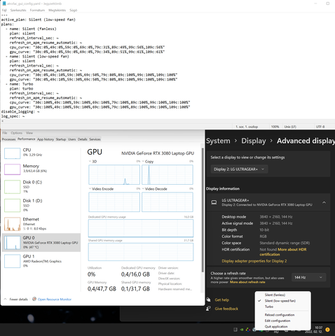 GPU +140 VRAM+300, külső 4K-s monitor, HPET-OFF, és CPU-Parking off, venti 100%-on minden hőmérsékleti sávban és megvártam amíg eléri a max fordulatot, KH pasztázás. Amúgy minden gyári
