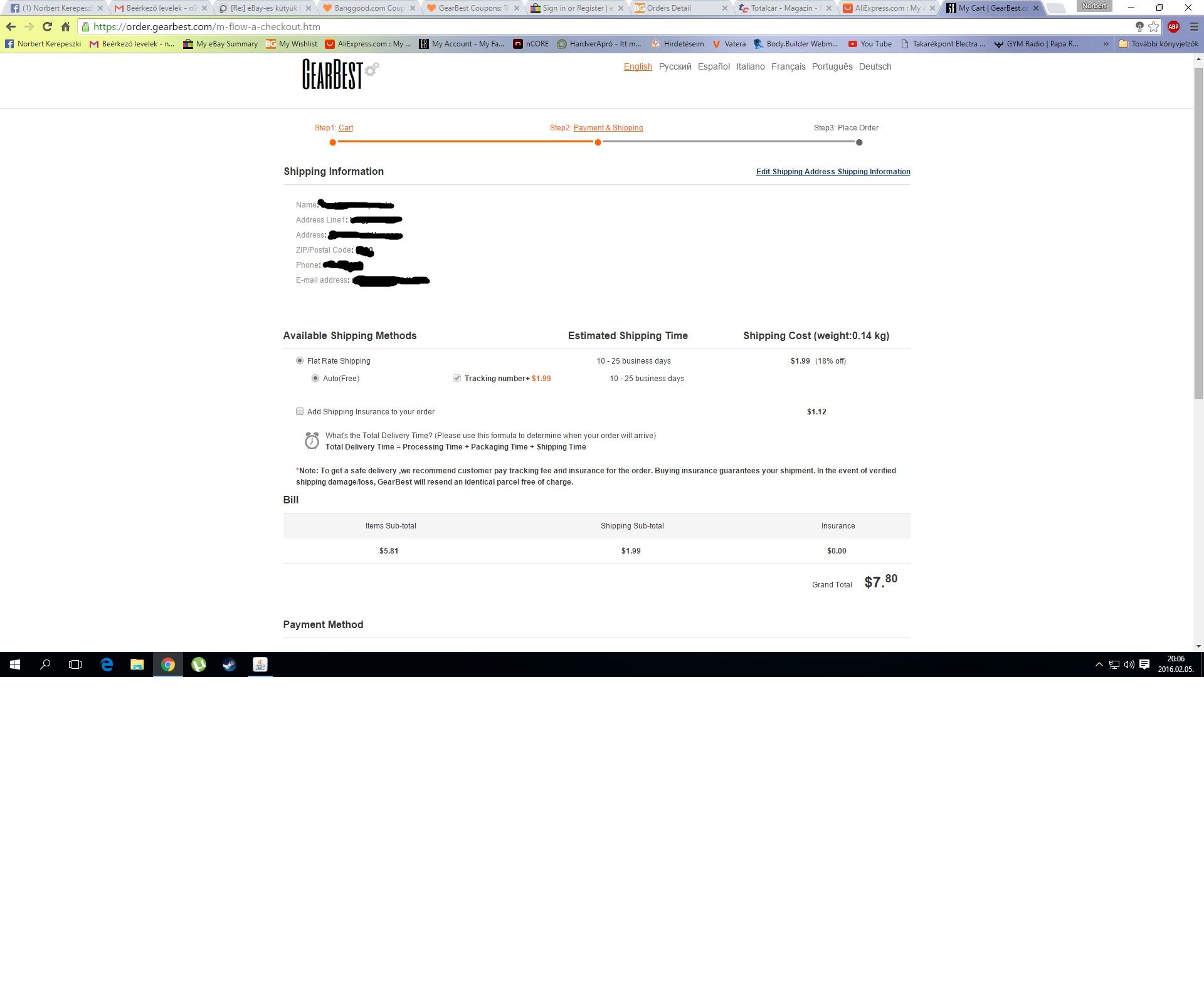 6.78$ amit szeretnék, free shipping, de fizetés előtt, ahol összegzi a rendelést hozzáad + 1.99$-árt Tracking Number gyanánt, (Auto) jelöléssel, és nem tudom kikapcsolni ?