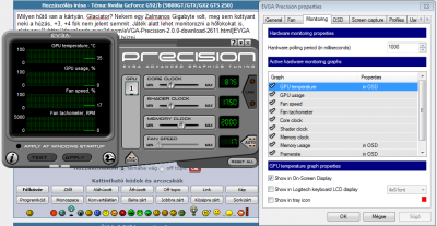 Van a kártyának 2D-s vezérlése? Vagyis visszaveszi az órajeleket ha nincs terhelve? Mert ha igen, akkor nincs mitől melegednie idle módban. Játék alatt monitorozd. Ha bekapcsolod a precisionban amik nekem is ki vannak pipálva, a villás kulcsra kell kattintani, akkor jön elő az ablak, majd a monitoring fülön rákattintasz a GPU temperature sorra, és alul kipipálod a Show in On-sreen Display-re, majd leokézod és a jobb fent lévő kis háromszöggel lerakod tálcára a progit.