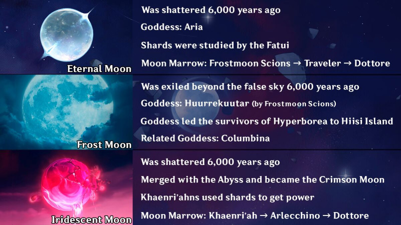 Van egy Diana nevű szarvasa (Frostmoon Scion, Lauma), egy némileg Paimonra hasonlító seelie szerű szelleme, A lunar oculire hasonlító gömbje. A trailerben látott környezz elég Nod-Kra, Hold-szerű