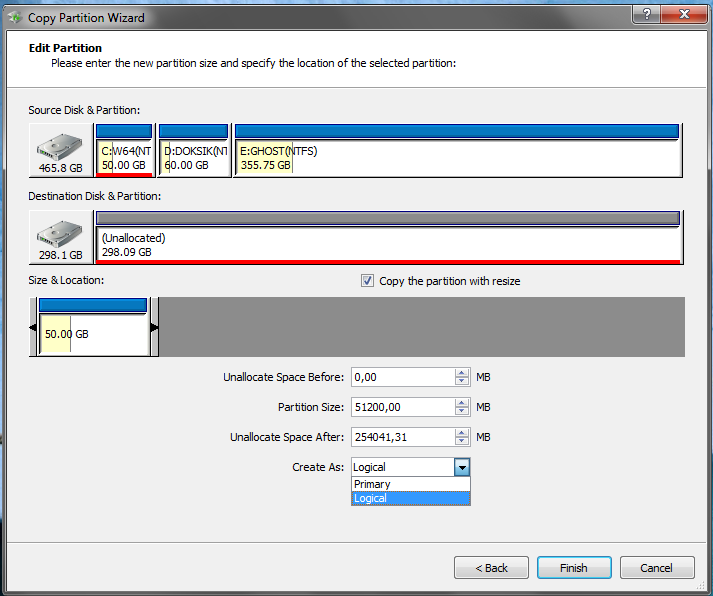 Nem jol csinaltad, de direkt letoroltem a particiot a masodik WD 320Gb vincsirol, az elsodleges az egy Hitachi 500 Gb-os 3 particiora osztva. Tehat ures particionalatlan vincsire klonoztam a Hitachi C:\W64 50 Gb-os particiojat, a Partition to Partiton opcoval.