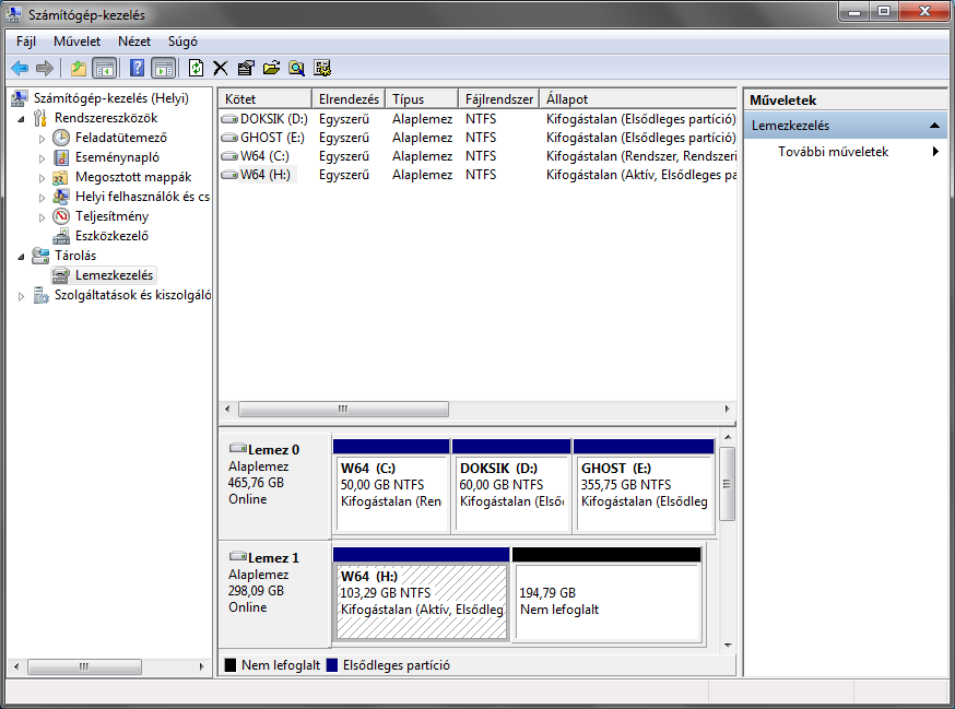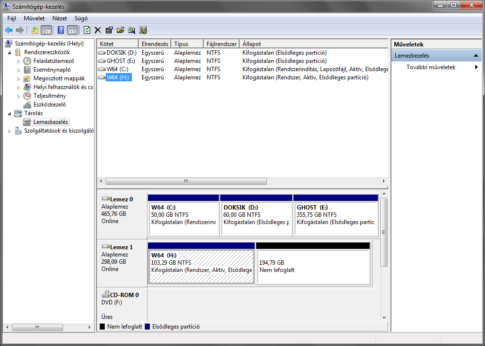 Reboot, majd szepen elvegzi a munkajat nagyjabol 5 perc alatt vegzet majd ujra inditva a BIOS-ban a sorrendben elsonek beallitott es a forras vincsi C:\-rol bebootol, hiszen arrol masoltunk ezutan Fontos hogy a mar atmasolt masodik vincsi esetemben a H: betujelu C:\ particiojat Aktiva kell tenni hogy arrol is belehessen bootolni. Futtatasba ird be diskmgmt.msc es mint a kepen is lathato lett egy C:\W64 particio a H betujelu masodik WD vincsin is, azt kell Aktivva tenni