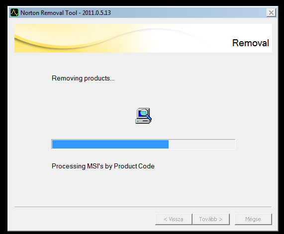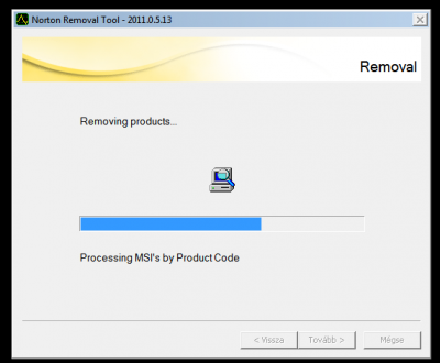 Elinditod az SymNRT-Norton.Removal.Tool-2011.0.5.13.exe-t ker egy megerositest hogy rendszergazdai joggal mehessen OK termeszetesen, ezutan ki akar menni a netre de nem engeded mert amugy sem tudna, es kulonben is mikoze a Norton-nak hogy miert szeded le a vackat. Next. Ekkor feldob egy ablakot amibe be kell irni az ablakban lathato karaktersorozatot, fontos a kis es a nagy betu, ha nem talalod el dob masik karaktersorozatot a lenyeg hogy elfogadja, ezutan elindul.