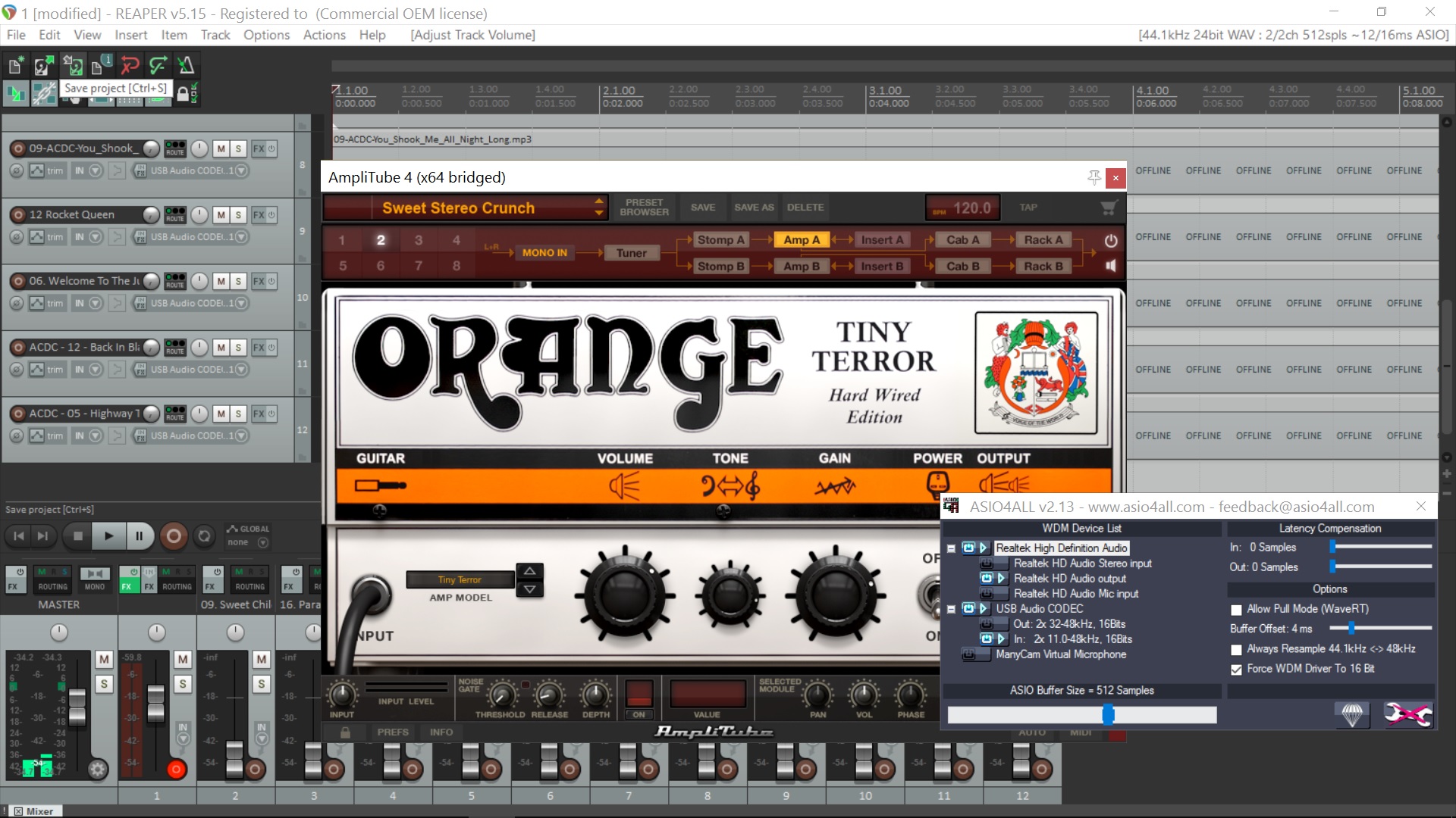 asio4all-al használod ?Nekem most egy guitarface II-vel van összekötve laptoppal+asio4ll.Ez mondjuk ilyen átmeneti megoldás a közeljövőben veszek multieffektet.12ms latencyt van de nem észrevehető abszolút,Néha kicsit recseg azt lehet a thresholdgate-el vmelyest csökkenteni.Én amiért nem szeretem ezt a szoftveres megoldást annak az az oka hogy nincs lábkapcsoló ami majdnem mindig kell,akár csak egy clean/dist csatornák közti váltás akár csak egy boost vagy egy wah a másik hogy kisajátítja a hangeszközt tehát nem tudok futatni mondjuk egy guitar pro-t közben vagy egy youtube-ot ami a tanuláshoz nekem kell.Szöval én nem nagyon költenék erre a vonalra.De az tény hangminőségben nagyon jót el lehet érni vele.Szerintem a guitar riget meg az amplitube-ot (nekem mind2 van)is jobb daw-on belül használni.Én a reapert szeretem.Így tudok alá tenni backingtrackot.A beállításokban van egy olyan plugins-->vst és ott be kell tallozni a guitar rig vst mappáját.Ez általában a C:\Program Files\Native Instruments\VSTPlugins 64 bit.