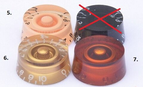 Bézs pickupkereteim pont vannak, koptatót és gyűrűt a kapcsoló alá rendelek még bézs színben, de a potikat nem tudom eldönteni, milyenek legyenek. Próbáltam több online gitártervezőt, de egyik sem az igazi, nem tudtam ilyen részletesen tervezni. Szóval ezek közül kéne dönteni: