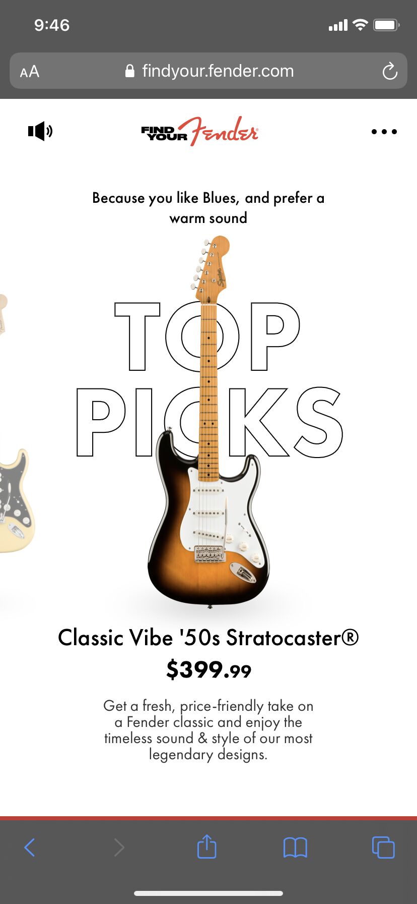 Első körben érdemes lenne becélozni, hogy milyen stílusú/hangú elektromos gitárt szeretnél, sokat számít, hogy milyen hangszedők vannak benne, de a forma is eléggé meghatározó lehet, akár kényelem szempontjából is. Félig-meddig country irányból indultunk, így alapértelmezettnek tűnhet egy Telecaster, 400 dollárért van Squier Classic Vibe, de hiába, ha az Neked éppen kényelmetlen, vagy nem is szereted a hangját.