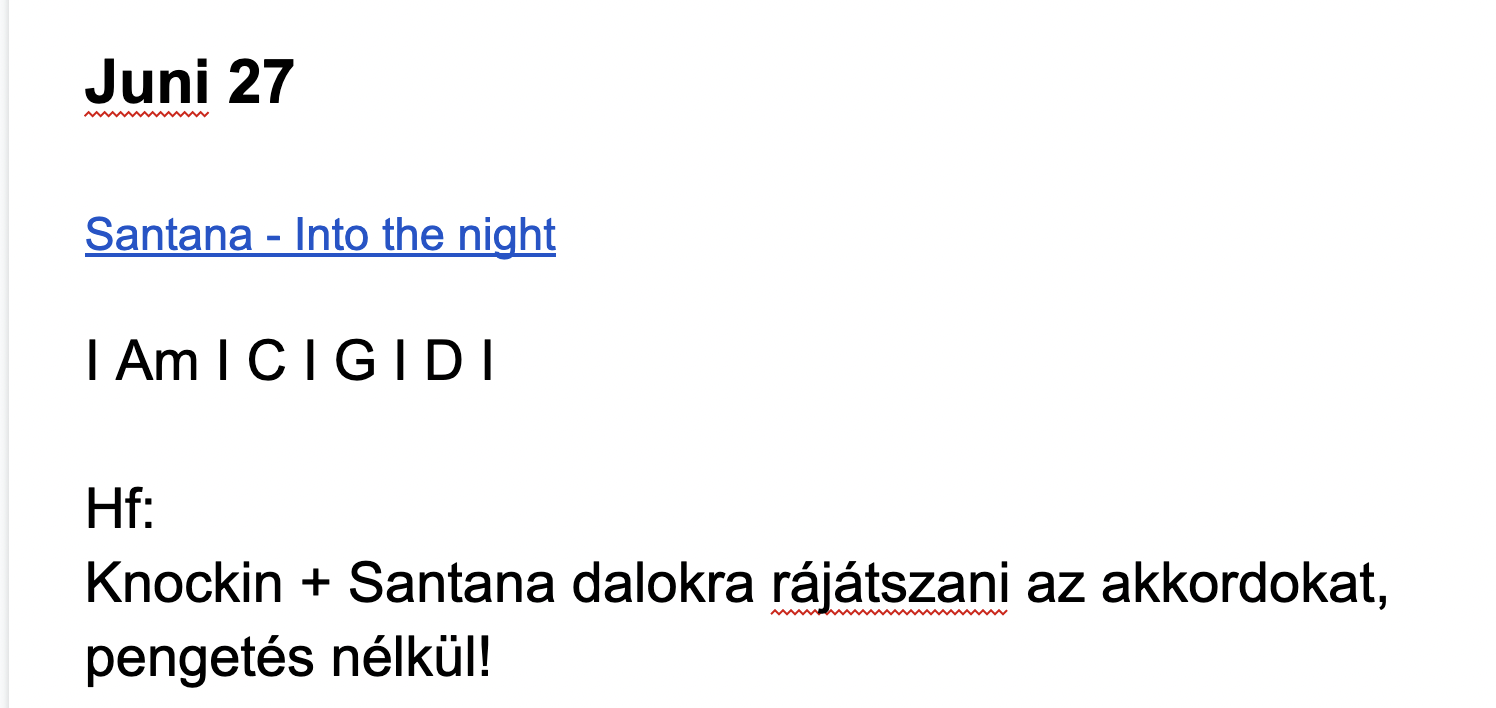 Ezt a Santana-számot az egyik óra végén kezdte lejátszani YT-n, de csak elkezdtük. Mondta, hogy na, pengessem bele az akkordok első hangját. Mondtam neki, figyi, gőzöm nincs mikor kell pengetni, nem tudom hol kell belépni a szám elején, hallok több gitárt is, nem tudom.Nem mutatta meg.Az volt a válasz, hogy azzal kell kezdeni mindig, hogy nagyon sokszor meghallgatni először egy számot, ha meg akarom tanulni. És fülelni közben. Ezzel az útravalóval engedett el, és beírta, hogy házi feladat rájátszani. Oké, de mégis hogy a viharba? Ha én tanár lennék, azt csinálnám, hogy a kezembe venném a gitárt, menne a szám, játszanám, és mondanám a nebulónak, hogy próbáljuk együtt csinál, próbálj meg követni, vedd fel a ritmust.