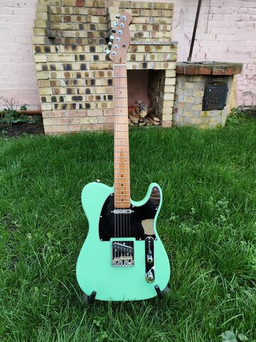 Meghirdettem a zöld telecastert, aminek én válogattam össze az alkatrészeit AliExpressről, egy barátom előfúrta a lyukakat a nyers testre és nyakra és ha már nála volt, össze is csavarozta. Az elektronikát én forrasztottam bele meg én is állítgattam be. Nagy öröm volt az elkészítése, de a sportos gitárok mostanra teljesen elcsavarták a fejemet, és úgy voltam vele, hogy úgysem játszom rajta, használja más, mert kár lenne, ha csak porosodna.