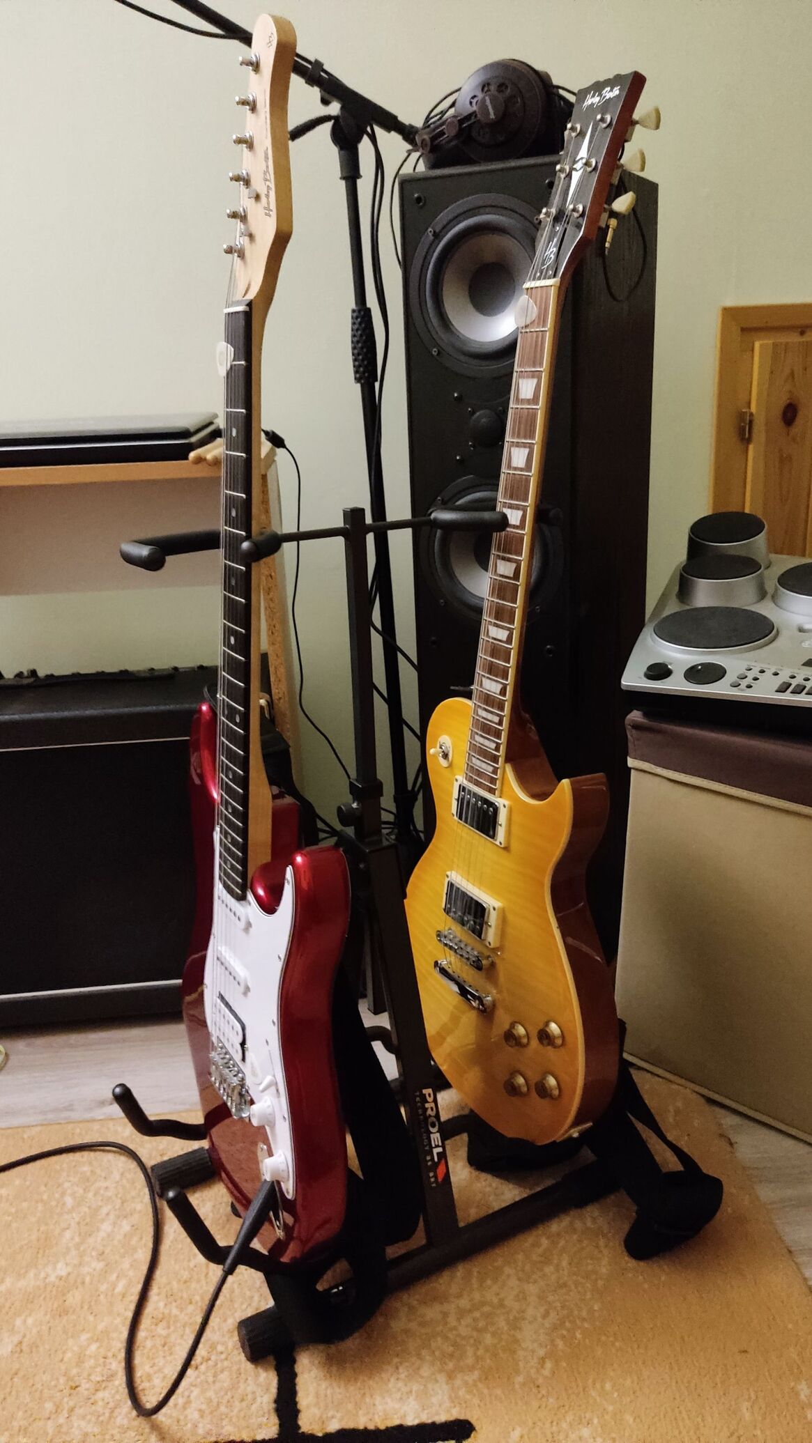 Véletlenül találtam egy hirdetést dupla gitár állványról a közelben és megvettem (4ezer forint volt), használt de hibátlan új állapotú. Nagyon tetszik, kevesebb helyet foglal, mind eddig a két egyes és mozgatni is könnyebb egyik helyről a másikra. A hátsót direkt fordítva raktam be, mert így is stabilan áll és szemből látom a gitárt nem hátulról. [kép] (Lehet senkit nem érdekel, de gondoltam megosztom veletek