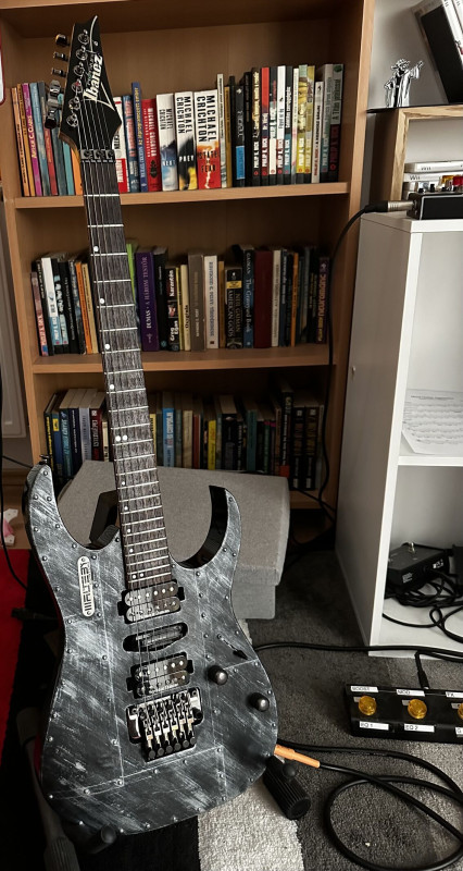 Es ennel az RG nyaknal van meg eggyel vekonyabbjuk is...Ja, ez nem igazan "finish", ez egy utolag customizalt cucc, szerintem valami vinyl-szeruseg lehet rajta, vagy nem tudom, de rendes fizikai lapocskak/lemezek amik a kepen annak latszanak, valodi szegecsekkel meg minden, szoval tenyleg igazi rocker cucc