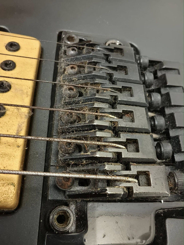 Na megint lenyakazta egy húromat - ezúttal a második legvékonyabbat, mert arra nem készültem - a fantasztikusan precíz Schaller Floyd Rose, ahogy a felső nyeregnél visszacsavaroztam. Ha ezt előre tudom, bennehagyom inkább a gyári szart, az legalább a húrokat nem pusztította.