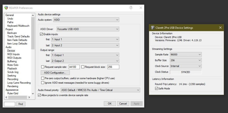 Így vannak beállítva most a dolgok. gondolom a Request Sample Rate-nek a Reaper beállításainál meg kell egyezni a Windows vezérlőpultban levő 48KHz-el és a Block méretnek meg a Nux 64 blokkméretével. Ha Cab IR-t használok akkor ott is 48KHz kell legyen a sample rate?