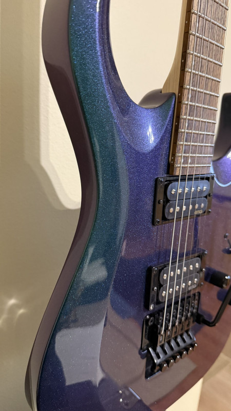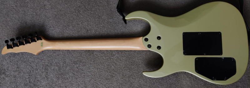 A Google se sokat tud ezekről, 90-es évek közepe lehet, ez kicsit hasonló. Valószínűleg csak szekrényben pihent sokáig, mert karcmentes-gyári fóliás. Kifejezetten stabil licenszelt floyd (bár a mindennapi használathoz minden irányban fixáltam), igazi strat hangú single coilok, a humbucker pedig pontosan úgy szól, mint a Burstbucker Pro a Gibsonomban.