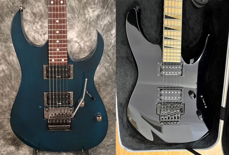 Itt egy kép, amin látszik kb. 1mm különbség mindkét pickup elhelyezésében, és ez már hallható hangzásbeli különbségeket okoz ugyanolyan pickupokkal is. A Jackson bridge pickupja kb. 1mm-rel távolabb van a hídtól, mint az Ibanezé. A nyaki pickupja és a fogólap vége között is van némi távolság, míg az Ibanez esetén teljesen rá van tolva a fogólapra a pickup.
