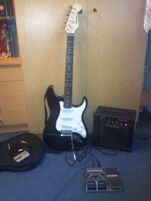 Kép a cuccokról, szerintem a képen is látszik, hogy gyakorlatilag új, a fehér részen még rajta van a fólia és még az sem karcolódott össze. Rákeresve a gitárra én ezeket találtam róla: Juharfa test és nyak, rózsafa fogólap, 22 bound, vintage tremolo, 3 single coil hangszedő. Ahogy írtam van hozzá tok valamint egy széles vállpánt is, a gitáron van 1 hangerő és 2 tone, igazság szerint a két tone hatását én eddig nem igazán vettem észre, és az erősítőn lévő tone gombét sem. A több állású kapcsoló viszont egyik állásban olyan a hangja mint egy akusztikusnak a másikban pedig már olyan elektromosabb